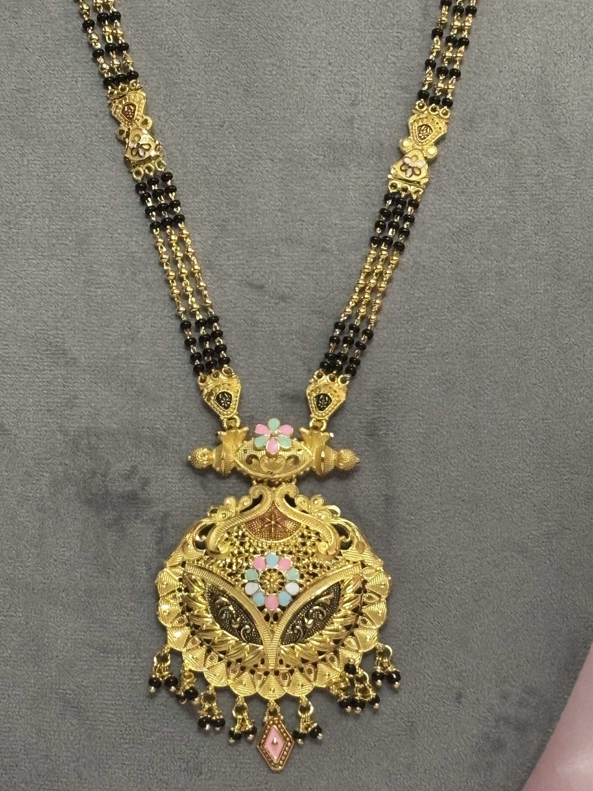 A traditional long mangalsutra featuring a detailed floral-meena pendant with antique gold motifs and black-bead dual chains. Perfect for brides who love a classic yet elegant look.GTT0073