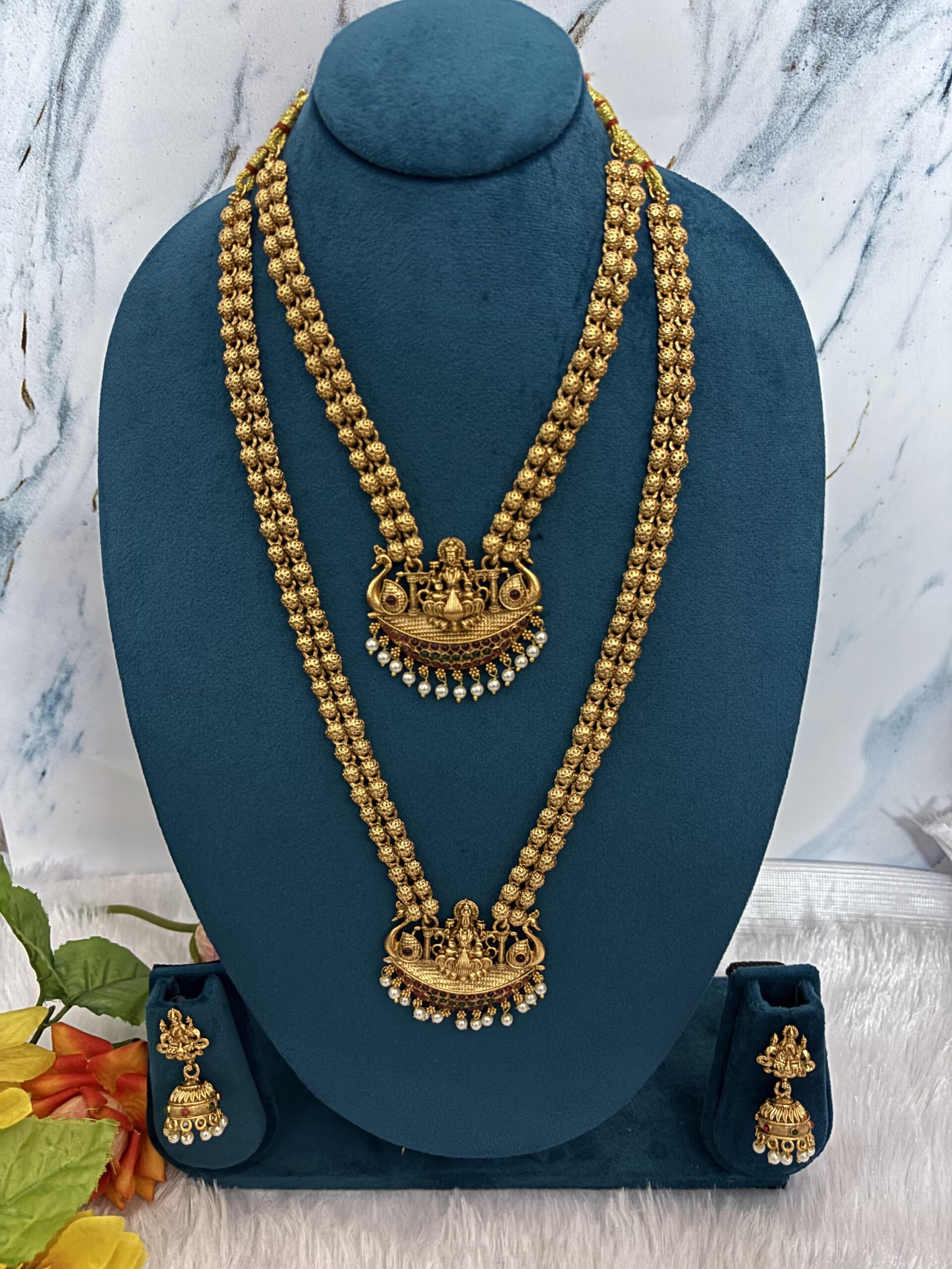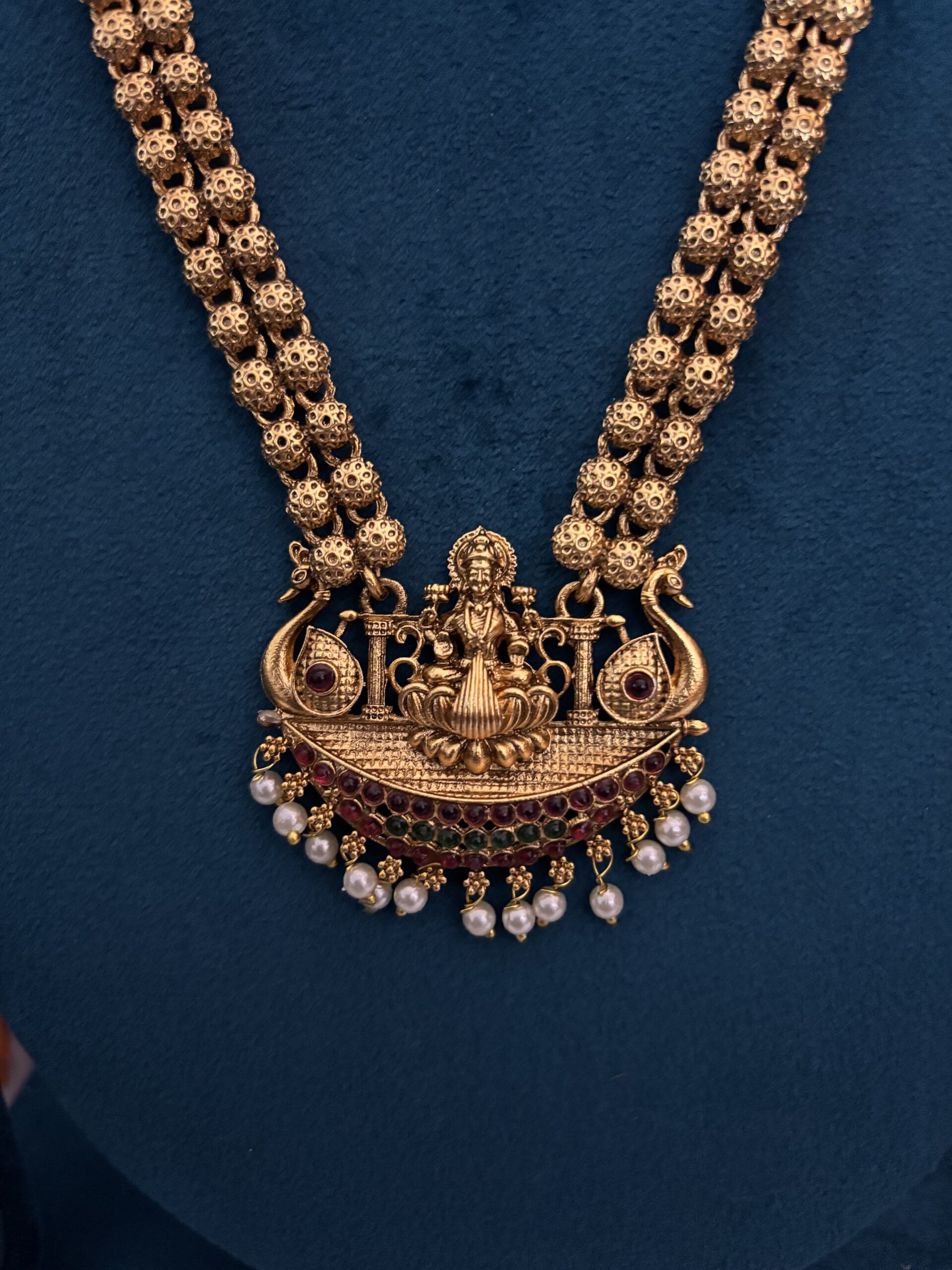 A graceful antique temple set featuring a matching necklace and haram adorned with intricate Lakshmi and peacock motifs. Designed with traditional gold ball chains and delicate pearl drops, this set includes matching jhumkas, bringing a divine and elegant charm to festive and bridal looks.GTT0023