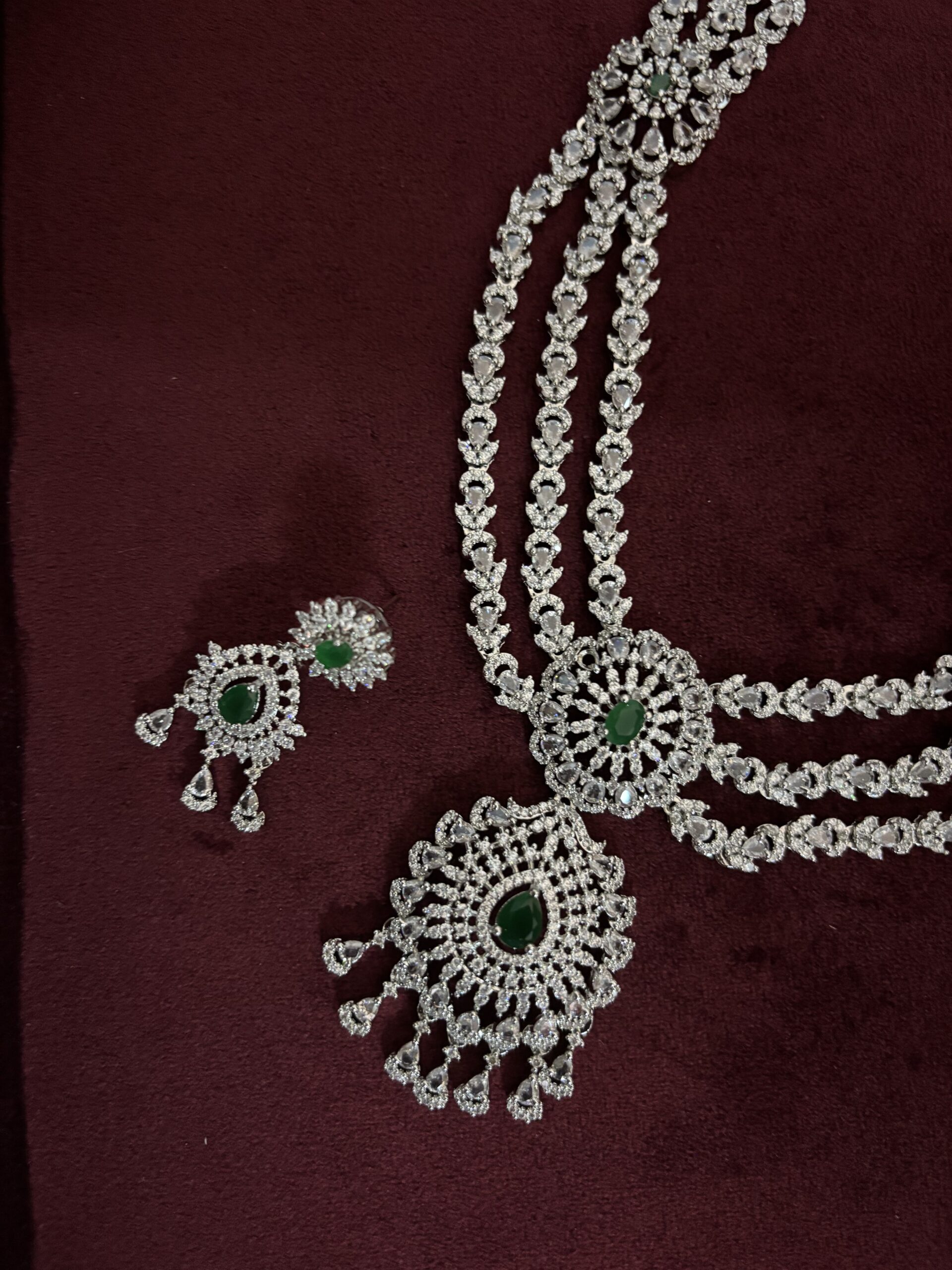 A stunning diamond-finish necklace set featuring triple-layered chains, an emerald-studded centerpiece, and delicate dangling stone details. Paired with matching earrings, this elegant set adds a radiant and luxurious touch to festive and special occasions.GTT0029