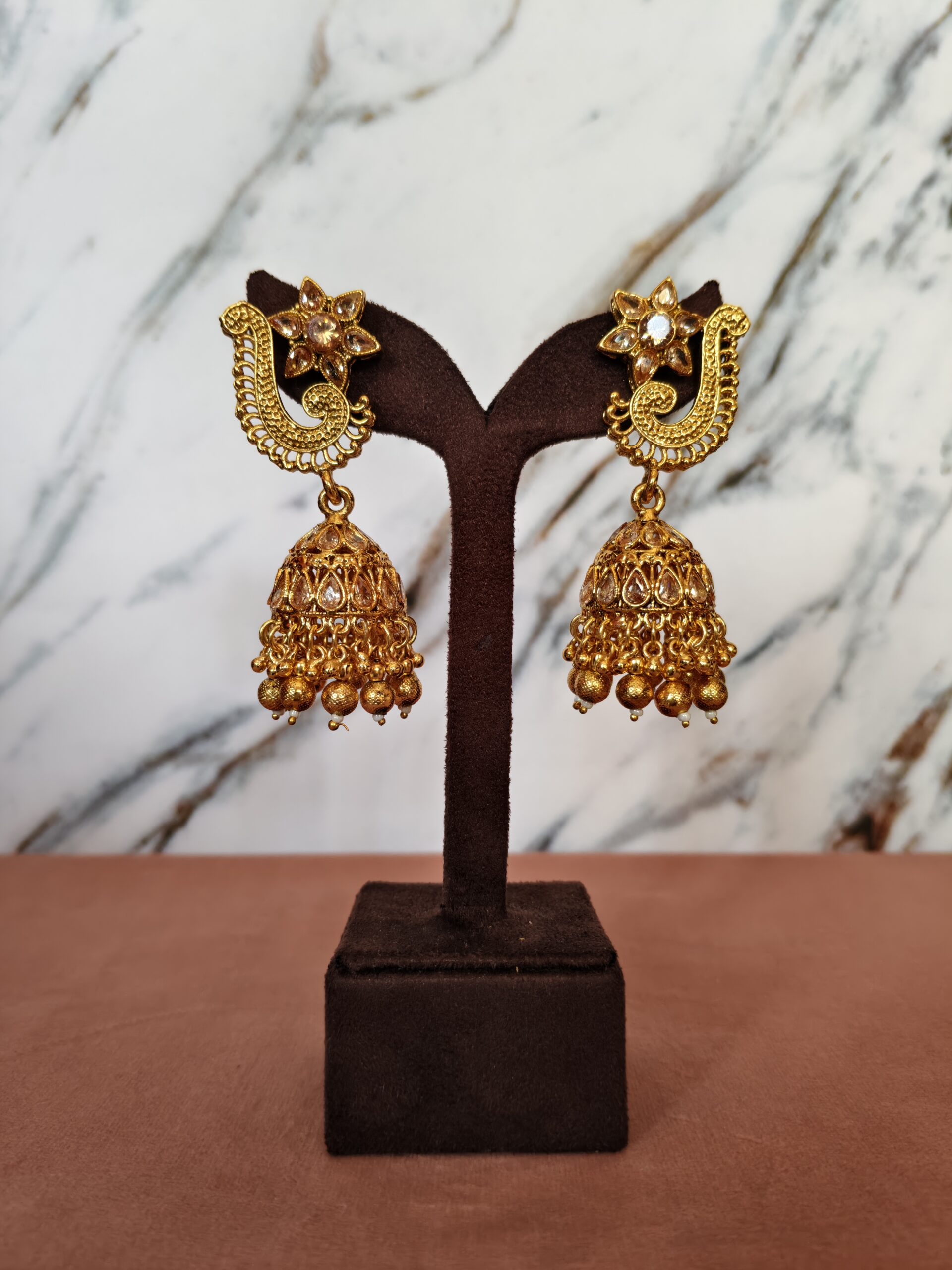 Classic gold-tone jhumkas with a floral stud, paisley detailing, and rich hanging beads—perfect for traditional and festive looks.GTT0082