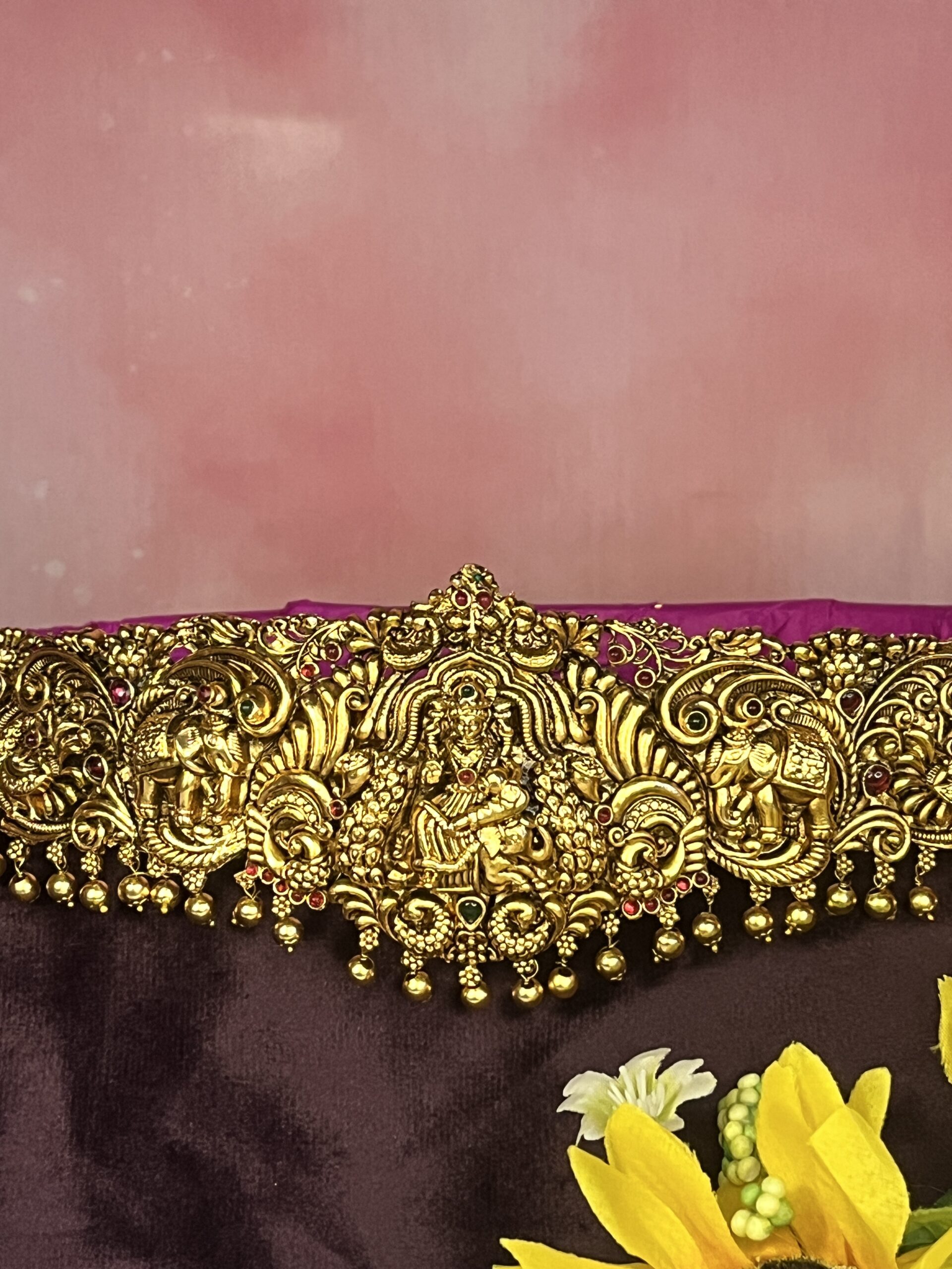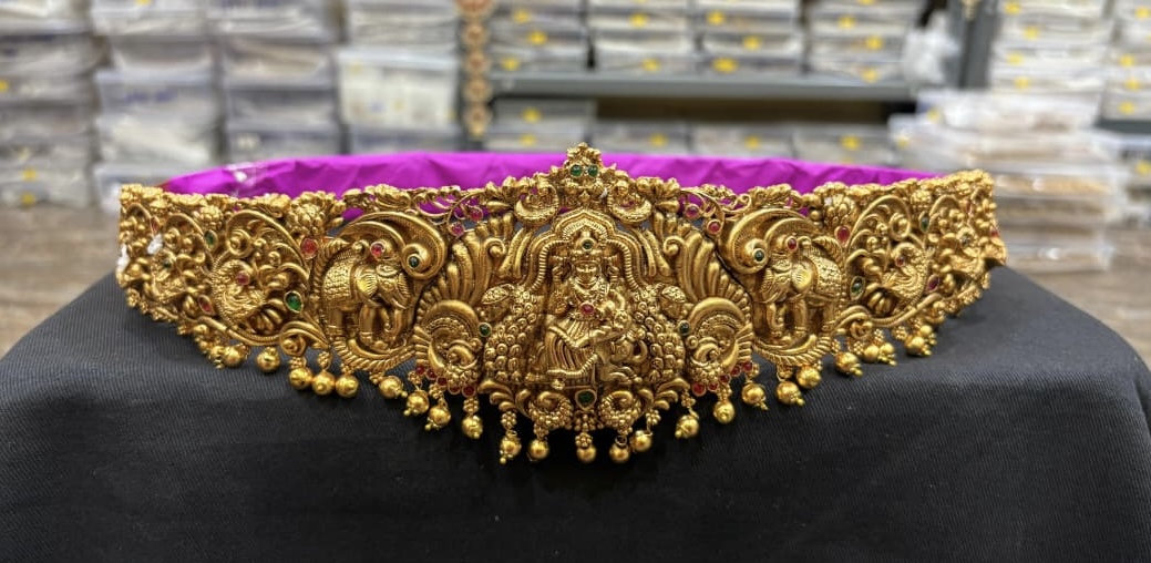 This luxurious temple vaddanam showcases a majestic Goddess Lakshmi motif at the center, flanked by intricately carved elephant figures and rich floral scrollwork for a truly divine bridal look. Crafted in a grand antique gold finish with ruby-tone stone accents and delicate hanging beads, this hip belt beautifully enhances silk sarees and pattu lehengas for weddings, receptions, vrathams, and other traditional ceremonies. GTT0116