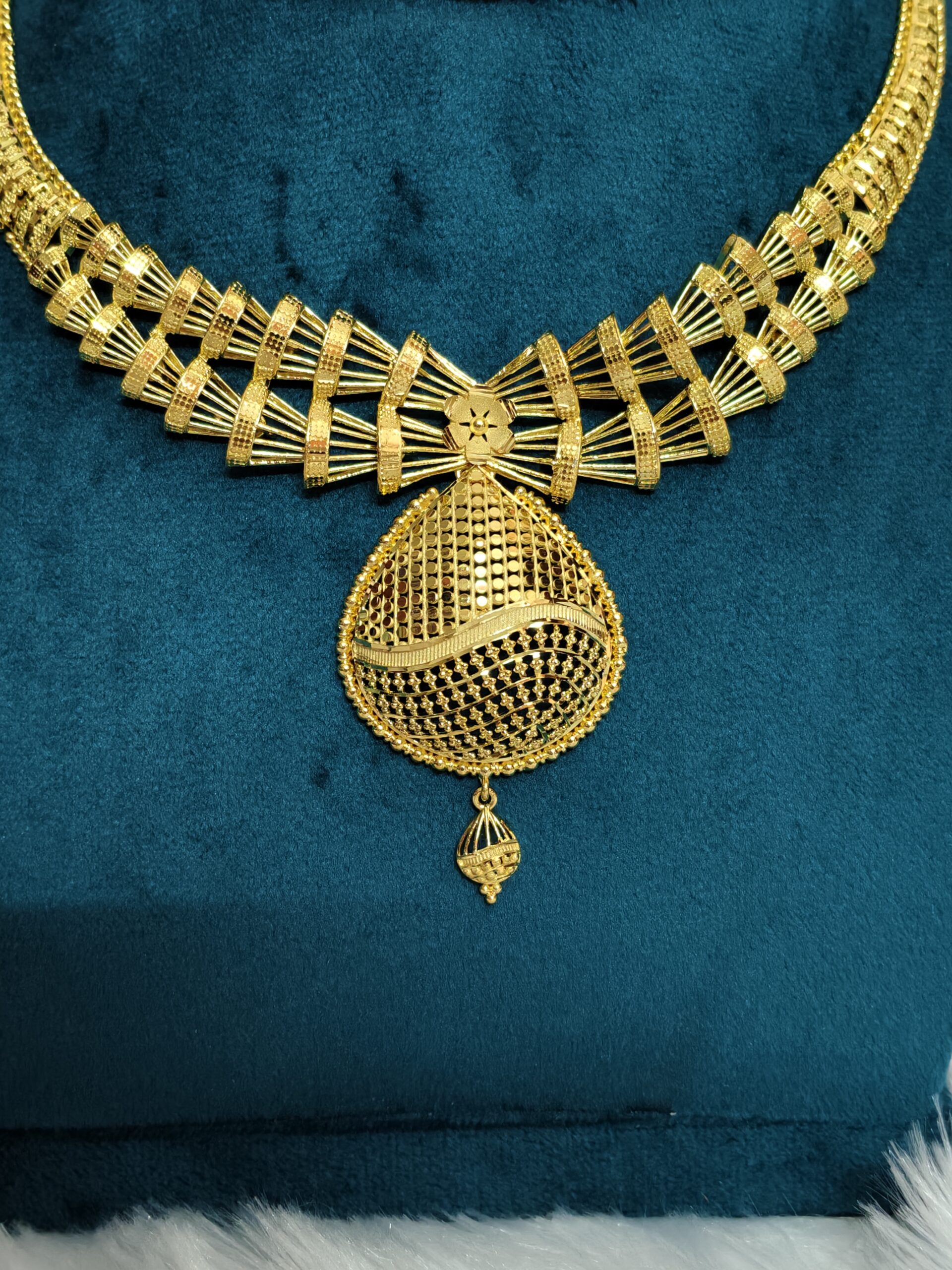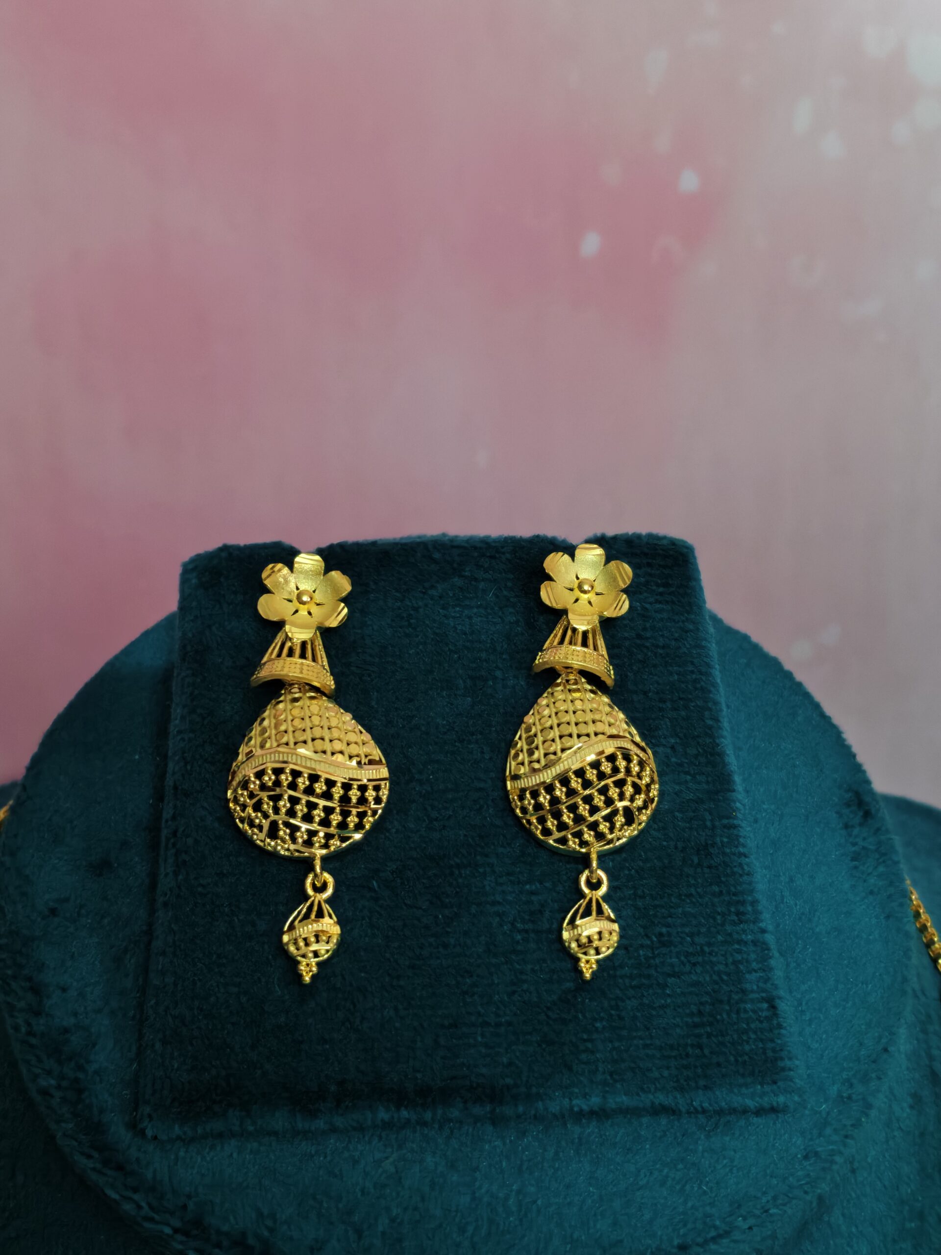 A classy gold necklace set featuring a stylish mesh-weave pattern and a dome-shaped pendant that adds a modern twist to traditional elegance. Paired with matching jhumka-style earrings, this lightweight yet grand design is perfect for festive wear, parties, and elegant occasions.GTT0064