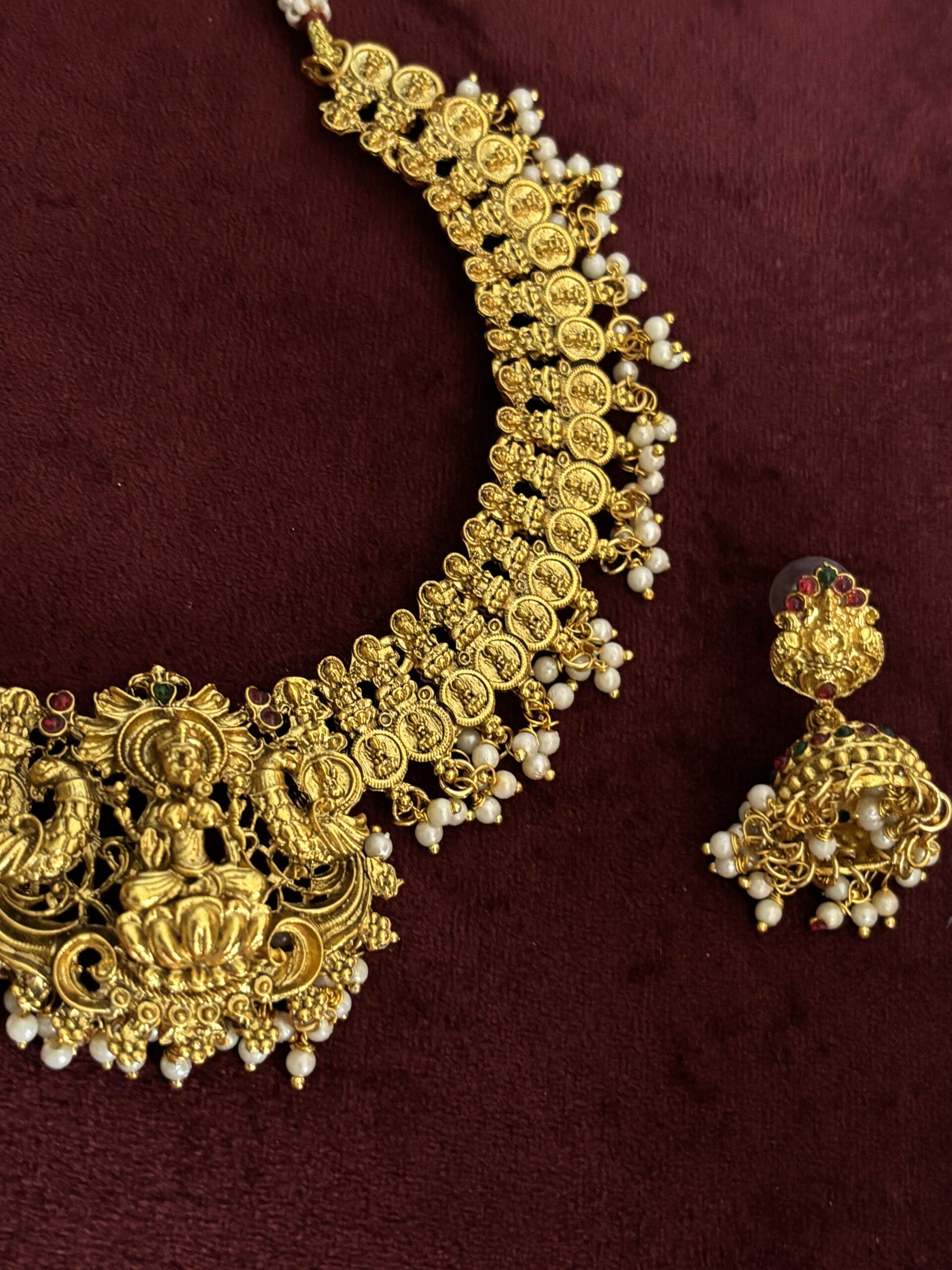 A grand temple-style necklace adorned with intricate coin motifs and a beautifully carved Lakshmi pendant. Finished with pearl droplets and paired with matching jhumkas, this set adds a rich and traditional touch to any festive or wedding look.GTT0045